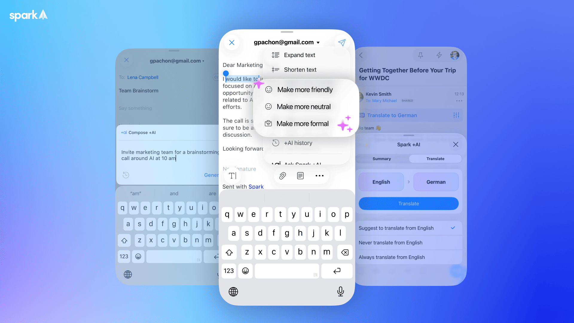 Spark +AI is designed to speed up and simplify your email work by generating and editing emails, helping you craft the perfect email in seconds.