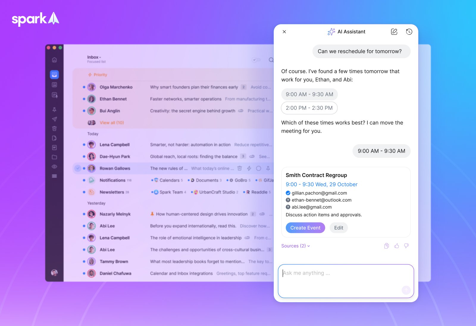 Whether you’re staying on top of personal tasks, collaborating with your team, or managing a packed calendar, Spark’s AI Assistant helps you focus on what matters, save time, and make better decisions with less effort.