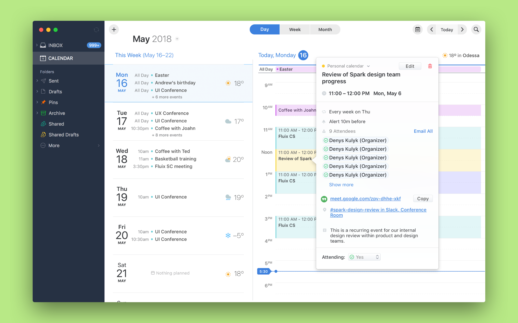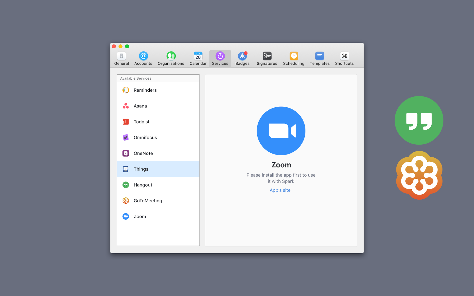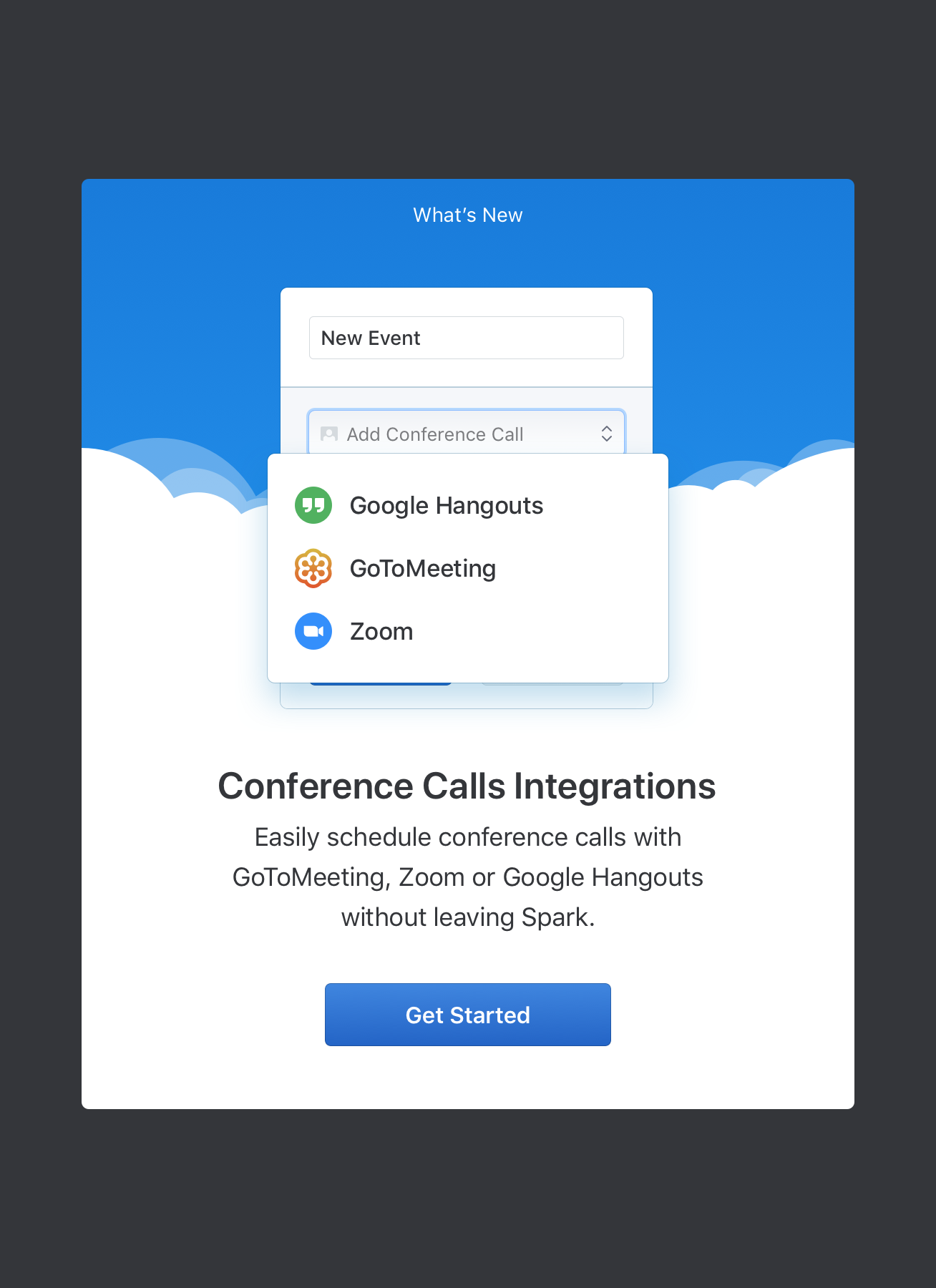 Spark’s latest update now integrates with the most popular online conference tools like Google Hangouts (or Google Meet, depending on what your team uses), GoToMeeting, and Zoom.us.