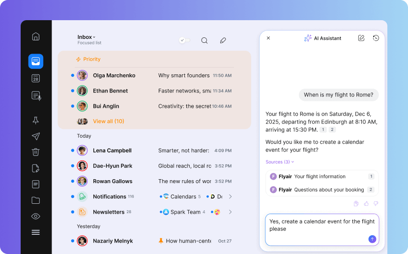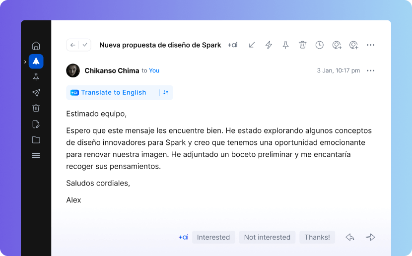 Traduction +AI : traduisez vos e-mails sans quitter Spark – plus besoin de copier-coller ni de changer d’application. La mise en forme est préservée après traduction.
