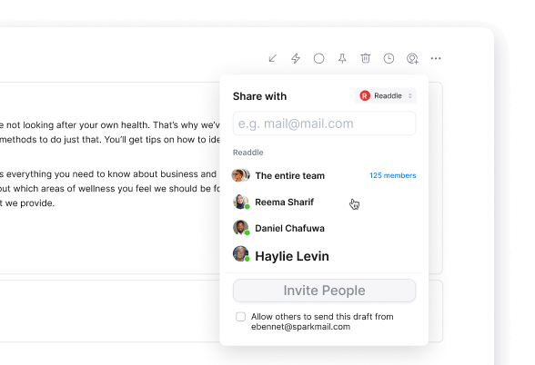 Créez une équipe pour collaborer sur les e-mails et travailler plus vite ensemble. Spark rend la collaboration aussi facile et gratifiante que possible grâce à des outils qui permettent à votre équipe de rester connectée.