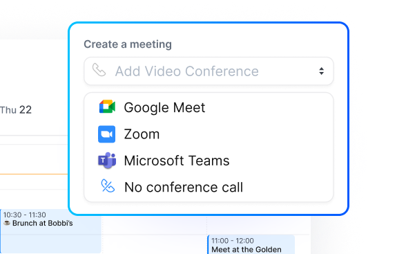Collegati a Google Meet o Zoom all'interno di Spark. Aggiungi i link per i meeting ai tuoi eventi con un solo click.